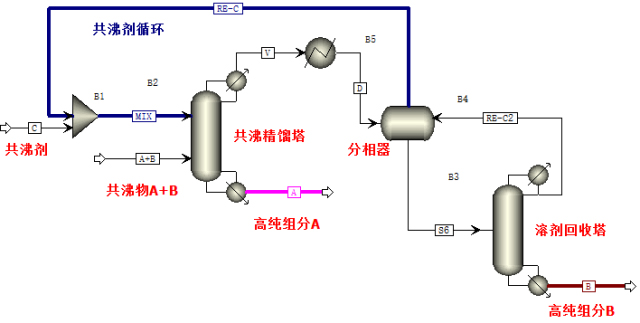 通常共沸精餾和萃取精餾的基本原理一樣,不同的是共沸劑在改變原溶液組分相對揮發度的同時,還與它們中的一個或多個組分形成共沸物。一個加入共沸劑的共沸精餾流程如下圖所示?;旌衔顰與B進入共沸精餾塔,加入共沸劑后進行精餾,塔釜為組分A,塔頂三元共沸物冷凝后得到兩互不相溶的液相,進分相器分層后,一層為組分A和共沸劑的混合物,可循環回共沸精餾塔實現溶劑循環,另一層為較純的組分B。如果B層含有大量的共沸劑,則需另一塔進行分離,得到純組分B和共沸劑,共沸劑循環使用。
