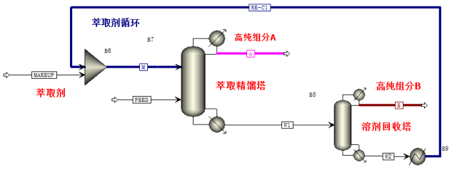 當別分離組分間的相對揮發度很小或沸點相差很小,采用普通精餾可能無法進行分離或需要塔板數非常多,可考慮萃取精餾,即加入某種高沸點的質量分離劑(稱萃取劑)來增大組分之間的相對揮發度,以減少分離所需要的塔板數。萃取劑可通過普通精餾進行回收,返回至萃取精餾塔循環使用。